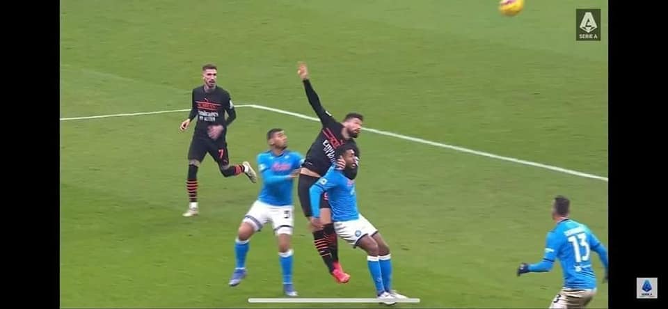Massa rimandato, l’arbitro del match non ha sfoderato una grande prestazione, poco lucido in alcune occasioni, vedi gli unici due gialli mostrati ai calciatori azzurri, un calcio d’angolo non dato al Napoli su deviazione clamorosa di Kessie poco dopo il gol del vantaggio e, la scarsa lucidità viene fuori anche nell’episodio finale, Girud commette nettamente fallo su Jesus, i due cascano a terra e solitamente l’arbitro è qui che ferma l’azione (vedi foto in basso), il direttore di gara decide di far proseguire l’azione e convalida un gol irregolare al Milan, in suo aiuto interviene il Var che coglie la posizione in offside di Girud. Lo stesso Jesus spiega come quella posizione di Girud è punibile, senza la presenza dell’attaccante milanista, Jesus avrebbe potuto ammorbidire quella palla e difenderla per l’uscita di Ospina.