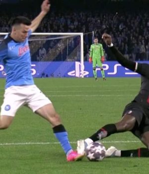 Leoa nel disperato tentativo di contrastare il tiro di Lozano, colpisce prima il piede del messicano e poi la palla, ovviamente colpendo prima il piede non consente il tocco da parte del calciatore del Napoli, rigore netto ma è veramente inspiegabile di come il Var non intervenga.