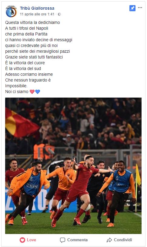 I capi ultrà delle due tifoserie, sembrano non poco contrari a questa idea. Ma una speranza lontana dai riflettori sta prendendo forma, infatti, dopo l’ultima partita di Champions League tra Roma e Barcellona, la “Tribù Giallorossa”, un folto gruppo di tifosi della Roma, ha dedicato la qualificazione in semifinale ai tifosi napoletani, perché dopo la sfortunata trasferta di Barcellona, moltissimi tifosi partenopei hanno inviato sulla pagina dei supporters romanisti, inviti a non mollare che l’impresa era possibile. Messaggi molto apprezzati dalla Tribù Giallorossa che, ha pubblicato i messaggi diventati poi virali. Una conferma questa del fatto che non tutti vogliono questa rivalità, ma, anzi, come si legge da molti messaggi, sognano di ritornare a vivere il derby del sole.