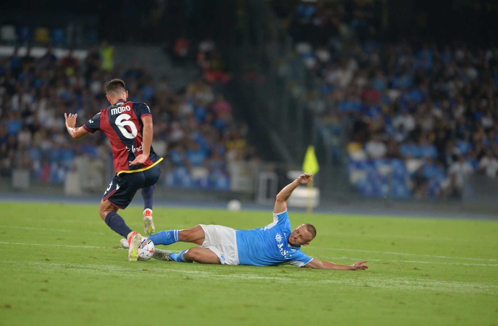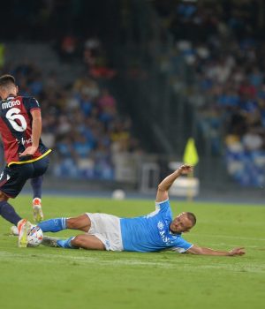 Partenza sprint del Napoli, al secondo minuto una bella azione condotta da Mazzocchi lancia nello spazio Raspadori che dal limite dell’area di sinistro sfiora l’angolino basso alla destra di Skorupski. Il match offre sensazione positive per i ragazzi di Antonio Conte, il pubblico nè coglie sin da subito la giusta energia e inizia a cantare ed incitare come non si sentiva da un bel pò al Maradona. Dopo una prima parte di partita giocata a ritmi elevati, si entra in una fase di stallo dove, gli azzurri si difendo in modo ordinato e tentano sempre e comunque di sviluppare una buona fase offensiva. Politano, Raspadori e Kvara creano grattacapi alla retroguardia di mister Italiano, ma non riecono a trovare la via del gol. Alla mezz’ora di gioco il primo e unico pericolo per Meret, ottima palla in diagonale di Ndoye per Castro che a tu per tu con Meret non riesce ad evitare l’intervento tempestivo dell’estremo difensore azzurro. Sul capovolgimento di fronte, Kvaratskhelia con un colpo di testa devia con precisione verso la porta un assist perfetto di Politano, Skorupski è battuto ma la sfera si stampa all’incrocio dei pali. Al Maradona i decibel continuano a salire, il pubblico percepisce che il gol è vicino, e infatti, nei minuti di recupero con una bella trama di gioco partita da capitan Di Lorenzo, il Napoli si porta al limite dell’area, assist perfetto di Kvara che con un lob scavalca la difesa e mette Di Lorenzo in condizione di controllare di destro e con il sinistro batte Skorupski per il vantaggio azzurro. Bello l’abbraccio di tutta la panchina, il capitano azzurro accarezza delicatamente lo stemma del Napoli mentre lo stadio grida il suo nome, all’intervallo è 1-0.