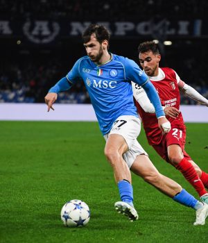 Gli ospiti hanno bisogno di vincere con due gol di scarto per centrare una clamorosa qualificazione, infatti a partire con il piede a tavoletta, è sono proprio i portoghesi che impiegano pochi minuti per impensierire Meret. Al primo vero affondo, dopo 9 minuti, gli azzurri passano, rimessa laterale di Di Lorenzo per Politano che arriva sul fondo crossa e trova la deviazione di Saatci. Stallo per un quarto d’ora, prima che la partita si risvegli al minuto 25 con un preciso e potente tiro dalla distanza di Horta, Meret è attento e devia in angolo. La partita subisce una scossa e chi inizia a rimacinare gioco è il Napoli noonostante difficoltà evidenti in fase difensiva, ma dopo due chiare occasioni da gol arriva il raddoppio, Osimhen servito da Natan dopo una gran discesa sulla fascia del brasiliano, appoggia in rete da zero metri. Primo tempo in archivo con un Napoli in vantaggio senza tanti sforzi.