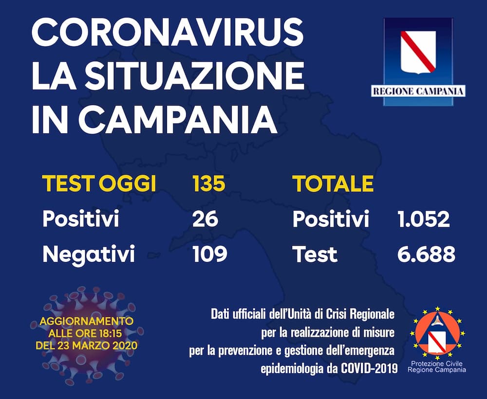 L’unità di Crisi della Regione Campania comunica che:- presso il centro di riferimento dell’ospedale Cotugno sono stati esaminati 120 tamponi, di cui 18 risultati positivi;- presso il centro di riferimento dell’ospedale San Paolo sono stati esaminati 15 tamponi di cui 8 risultati positivi.