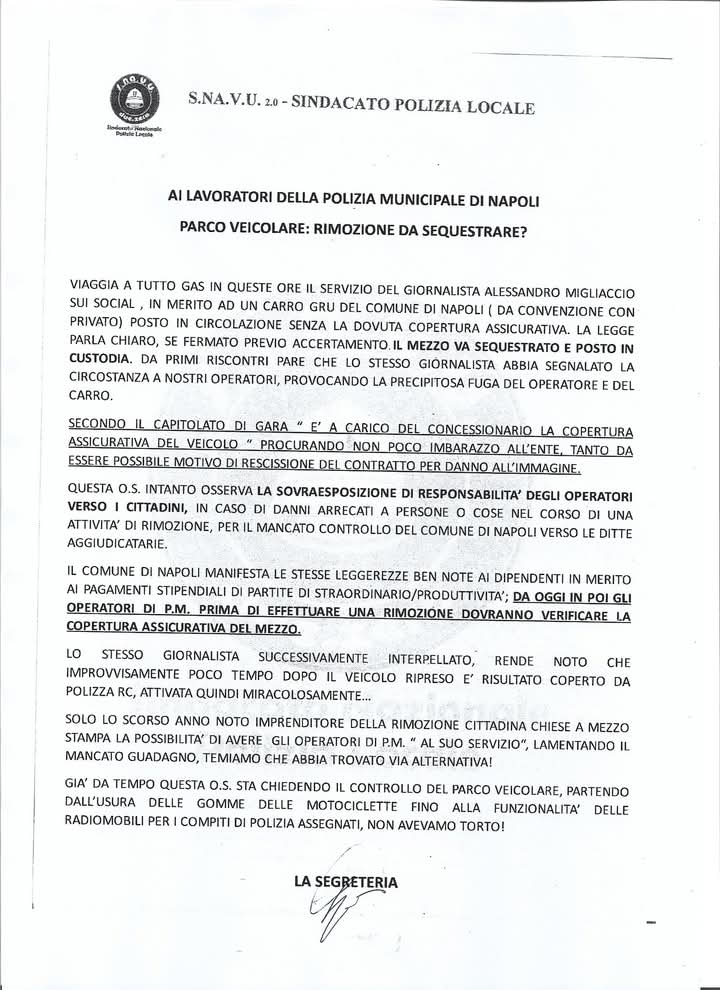 Seguiremo le inchieste di Alessandro, ma già è evidente che qualcosa si muove, infatti, dopo la deuncia di Migliaccio anche il sindacato della Polizia Locale emette un comunicato riportato di seguito.