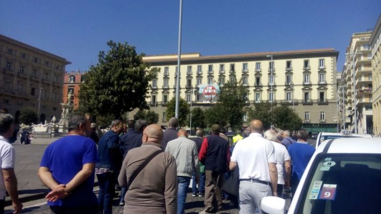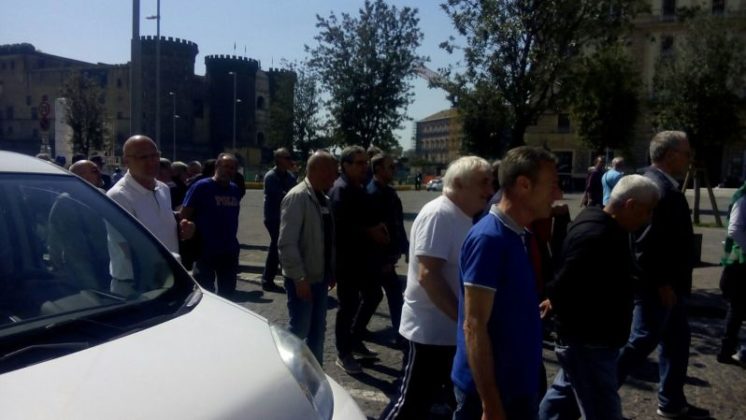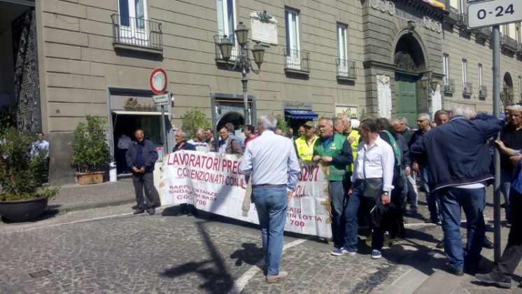 I lavoratori precari delle cooperative, legge 452/87, protestano in corteo per i mancati pagamenti degli stipendi. La manifestazione da piazza Municipio si sta dirigendo ora verso piazza del Plebiscito.