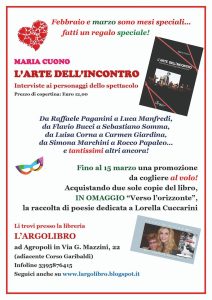 lavoro a causa della pandemia. L’Arte dell’Incontro è in promozione fino al 15 marzo. Acquistando due sole copie si avrà in omaggio una copia di Verso l’Orizzonte, la raccolta di poesie dedicata a Lorella Cuccarini. E’ un’occasione imperdibile. Per informazioni basta scrivere a largolibro@gmail.com, oppure telefonare al seguente numero: 3395876415”.