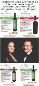 Sempre dal belcanto e dall’ottimo connubio con l’arte di Bacco, per esaltare e celebrare la bellezza della musica, della natura e dei suoi prodotti, nasce l’idea di designare il soprano Olga De Maio ed il tenore Luca Lupoli, “testimonial” della nota Azienda campana, produttrice di vini doc, “Terra di Briganti”. Situata a pochi chilometri da Benevento, sulle colline di Casalduni, con vista sul massiccio del Taburno, al centro di un crocevia di località, Pagliaia di Contrada Colli, Contrada Fontana Greca e bosco ferrarese, luogo di sosta e riposo dei briganti, negli anni dell’Italia unitaria, da qui il nome, è un’ azienda a conduzione familiare di antica e tradizionale generazione di esperti coltivatori dediti da sempre al culto della natura ed all’amore per i frutti della terra.