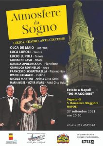 L’associazione Culturale Noi per Napoli, con i suoi artisti e rappresentanti, direttori artistici, il soprano Olga De Maio ed il tenore Luca Lupoli (nella foto), artisti del Teatro San Carlo, stanno riscuotendo un grande successo con lo spettacolo concerto “Atmosfere da Sogno”, proposto già il 10 agosto scorso presso il Castel Dell’ Ovo, per l’Estate a Napoli 2021, con sold out ed entusiasmante consenso di pubblico. Lo spettacolo viene ora riproposto il 27 settembre alle ore 20.30 nel cuore del centro storico di Napoli, presso il sagrato del Chiostro di San Domenico Maggiore per la Rassegna “Estate a Napoli Do Maggiore”, organizzata e voluta dall’assessorato alla Cultura del Comune di Napoli. Concerto spettacolo, ideato dall’associazione Culturale Noi per Napoli, interazione, connubio e dialogo tra lirica, teatro ed arte circense in un’atmosfera sognante in cui verranno interpretate le più belle romanze da salotto dell’800, d’opera, operetta e classici napoletani, introdotte da pagine teatrali con la novità assoluta della cornice di numeri acrobatici di artisti circensi, uno spettacolo adatto ad un pubblico di piccoli e grandi!