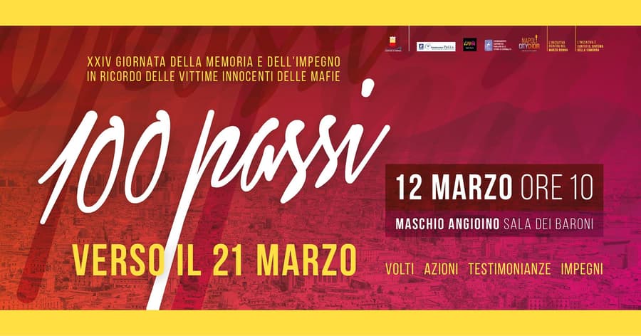 Il giorno 12 marzo, alle ore 10, nella Sala dei Baroni del Maschio Angioino, si terrà l’iniziativa del Comune di Napoli “100 passi verso il 21 marzo“. Si tratta di una manifestazione di rilievo sociale dedicata alle vittime innocenti della criminalità organizzata in occasione della “XXIV Giornata nazionale della Memoria e dell’impegno in ricordo delle vittime innocenti delle mafie”. Giornata riconosciuta con la legge n. 20/2017 che quest’anno, per la Regione Campania, si terrà ad Avellino. Ad introdurre il tema sarà Alessandra Clemente, assessore comunale ai giovani ed al patrimonio, e tra i partecipanti vi saranno Annamaria Palmieri, assessore comunale alla scuola ed all’istruzione, Luigi Felaco, delegato dei beni confiscati e presidente della commissione scuola del consiglio comunale di Napoli, Don Tonino Palmese, presidente della fondazione “Polis”, Bruno Vallefuoco, referente di “Libera Memoria”, Fabio Giuliani, referente di “Libera” in Campania, e Carlo Morelli, direttore del “Napoli City Choir”. Nell’occasione sarà presento il progetto “La Compagnia dei Simpatici”, a cura di Ivan Scherillo e della compagnia BBM Teatro, e vi sarà una tavola rotonda (“Musica come riscatto”) alla quale prenderanno parte i cantautori Andrea Sannino, Tommaso Primo, Tueff e  Nando Misuraca. A moderare sarà il giornalista Arnaldo Capezzuto