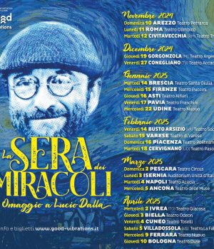 Uno straordinario spettacolo, un evento speciale per rivivere la storia di uno dei più grandi cantautori della nostra storia: La Sera dei Miracoli – Omaggio a Lucio Dalla. È la nuova produzione di Good Vibrations Entertainment, nota anche per aver curato lo spettacolo Canto Libero dedicato a Battisti & Mogol e il tributo ai Pink Floyd dei Big One. Dopo il tour estivo e il debutto autunnale al Teatro Olimpico a Roma lo scorso novembre, il tour prosegue con 19 nuove date con una conclusione a Bologna il 10 aprile. Martedì 4 marzo il tour arriva a Napoli: appuntamento al Teatro Acacia alle 20.30. Un evento speciale, per celebrare il compleanno dell’artista, che nasceva il 4 marzo 1943.