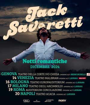 Partirà dalla sua amata Genova “NOTTI ROMANTICHE”, il tour teatrale di Jack Savoretti che arriverà anche a Napoli, il 20 dicembre. Il cantautore anglo-italiano si esibirà al Teatro Acacia, nella sua unica tappa al sud Italia. Questo tour, prodotto da Vivo Concerti in collaborazione con Concerto Music e Momy Record, farà tappa il 13 dicembre nel capoluogo ligure (ultimi biglietti disponibili) per poi proseguire a Venezia il 14 dicembre (sold out), Bologna (16 dicembre), Milano (17 dicembre), Roma (19 dicembre) e si concluderà proprio a Napoli venerdì 20 dicembre.
