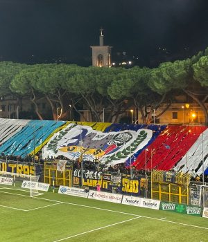 Menti dalle grandi occasioni, per la prima volta in questo campionato Castellammare di Stabia risponde alla grande all’invito e fa sentire tutto il suo calore alle vespe gialloblu, coreografia in curva sud che ricorda l’amicizia tra i padroni di casa, il Paris Saint Germain e il Napoli.